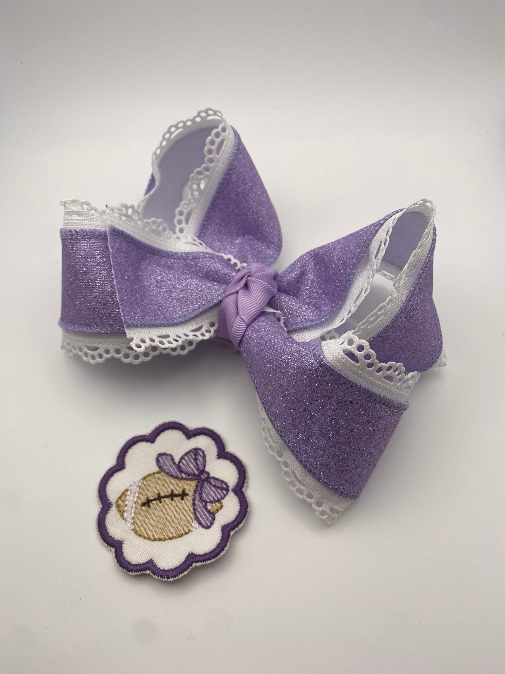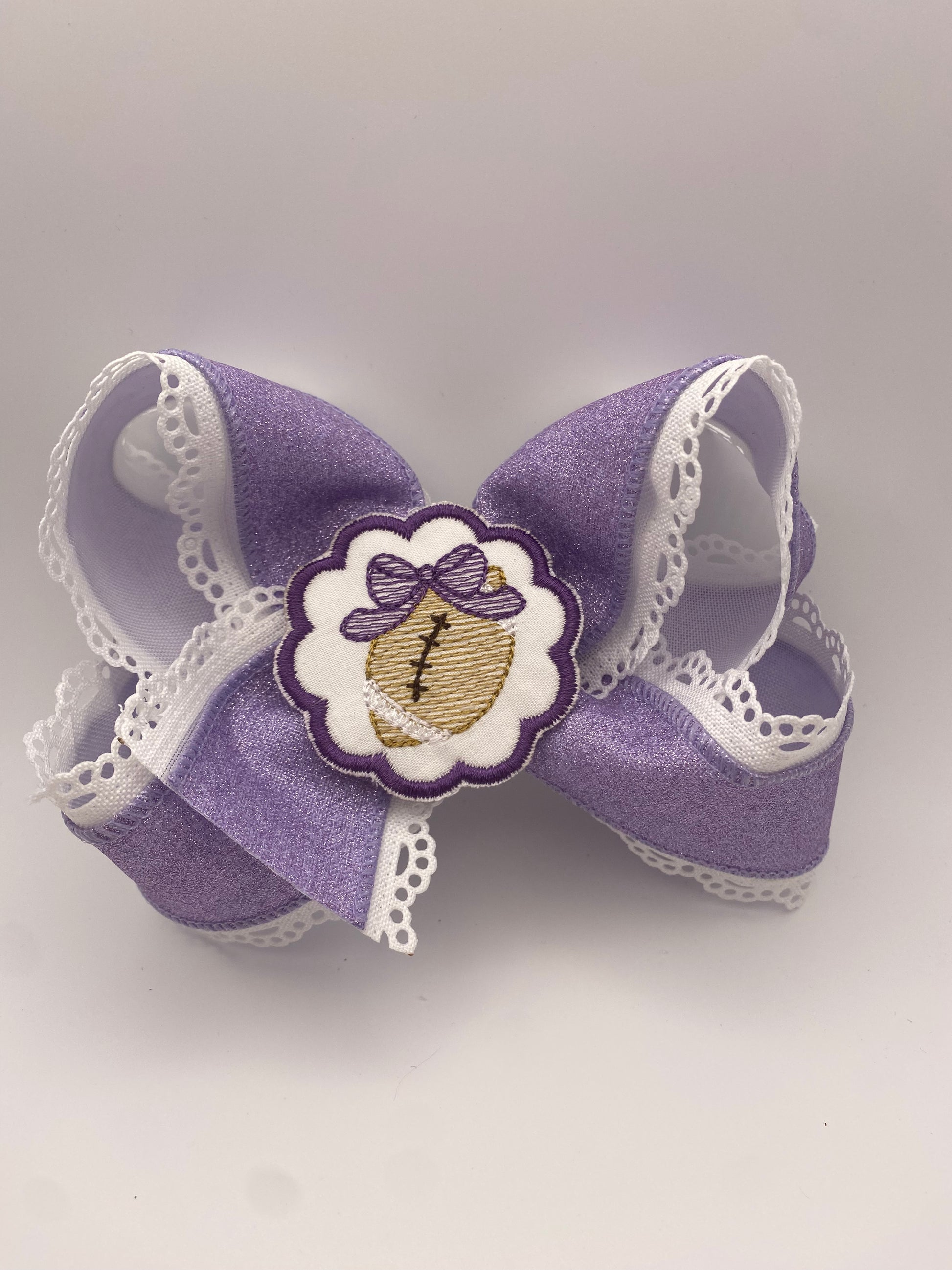 Pictured is our standard 6" bow. With interchangeable center embroidered football.