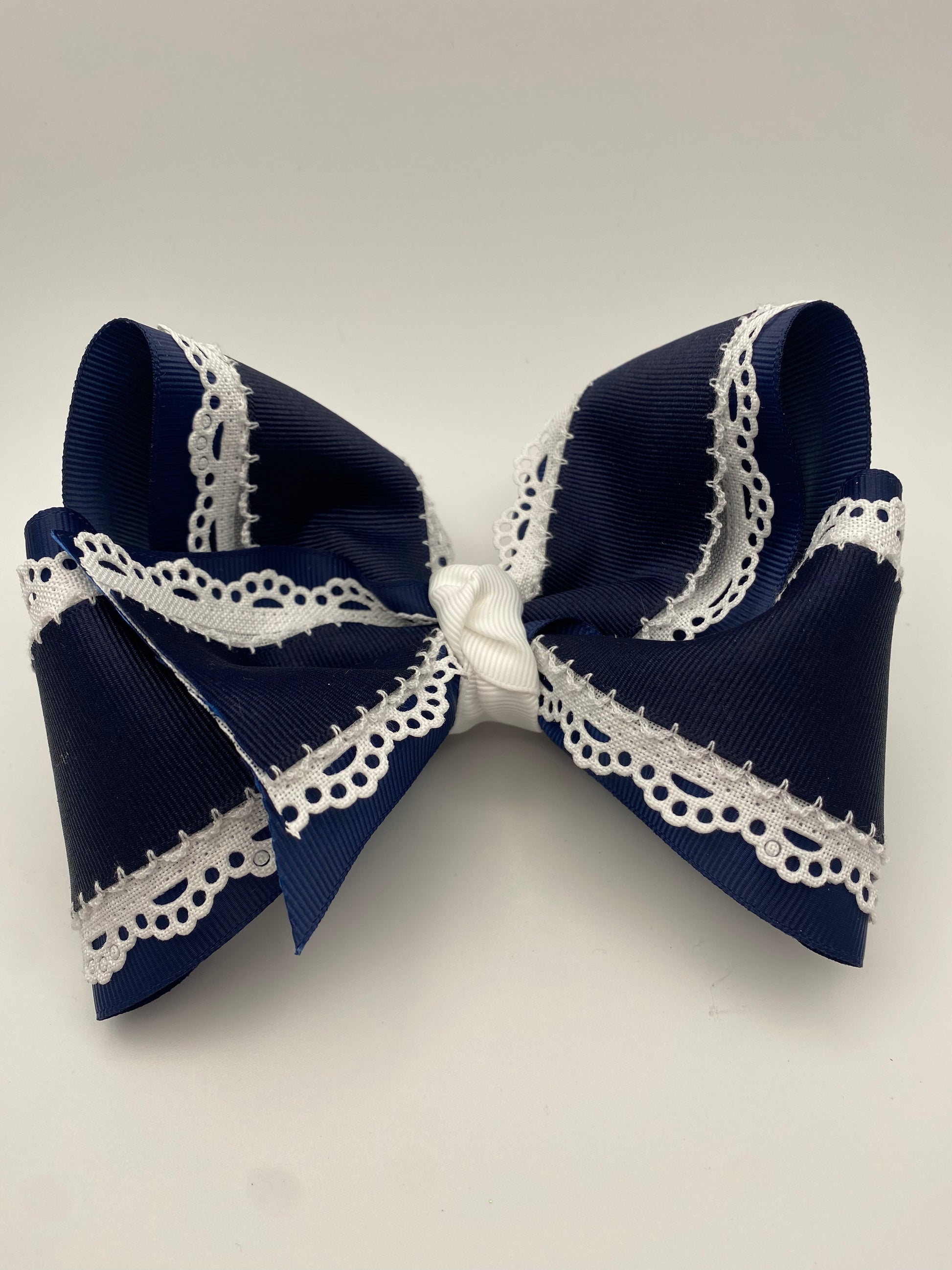 Pictured is our Navy Lace bow in our standard 6". Other sizes available.