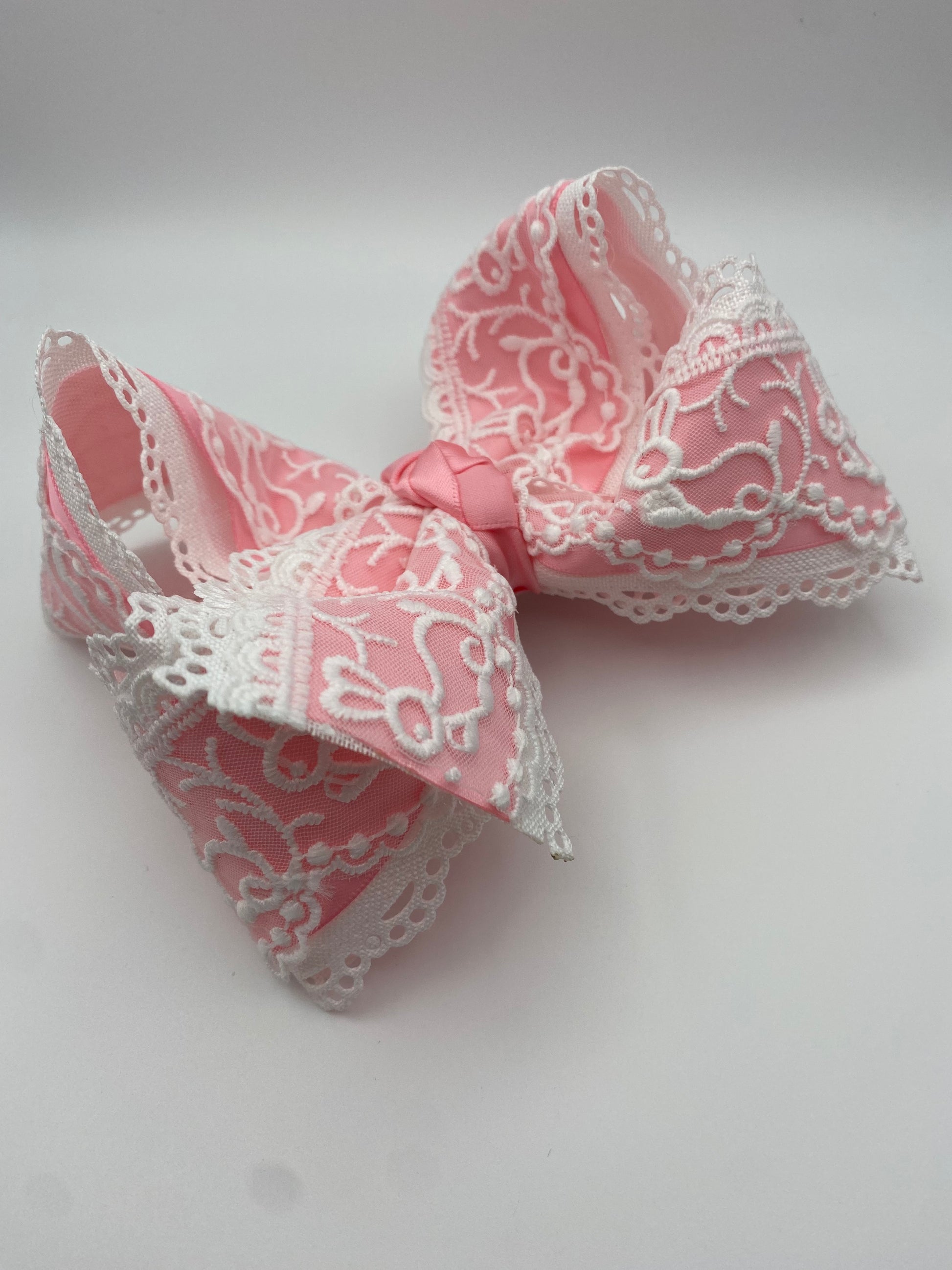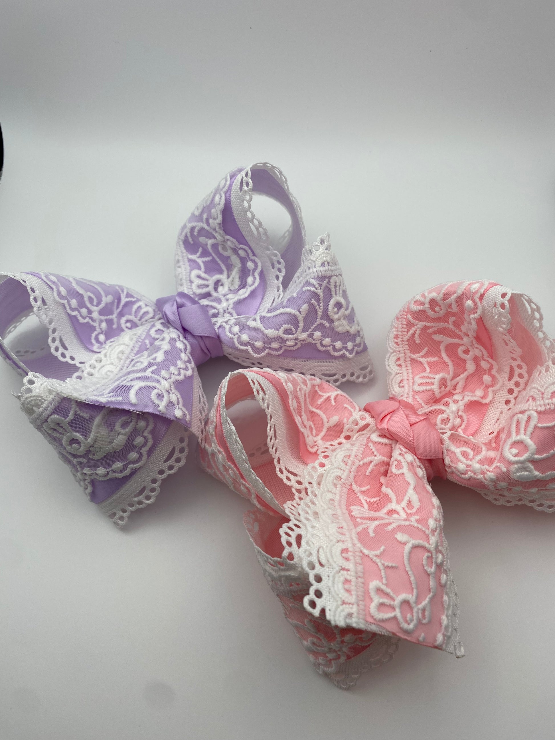 Delicate heirloom bunny embroidered lace over soft lavender satin and/or a peachy pink satin ribbon and on to white scalloped lace ribbon. Available in two colors. These bows were made for Sunday brunch, spring portraits, garden parties and the sweets little twirls. Handmade with love on an alligator clip with teeth.