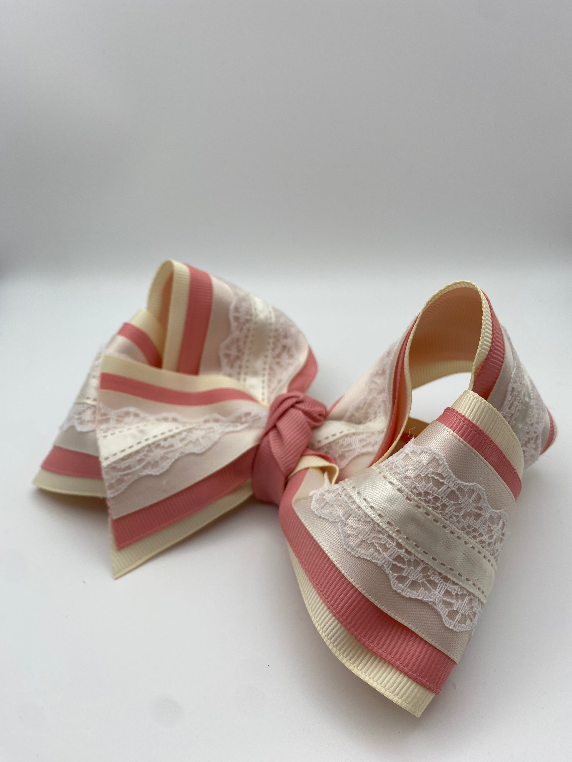 Pictured is our standard 6" size. This bow is 4 layers of grosgrain, satin and lace ribbons. Comes on a alligator clip with teeth.