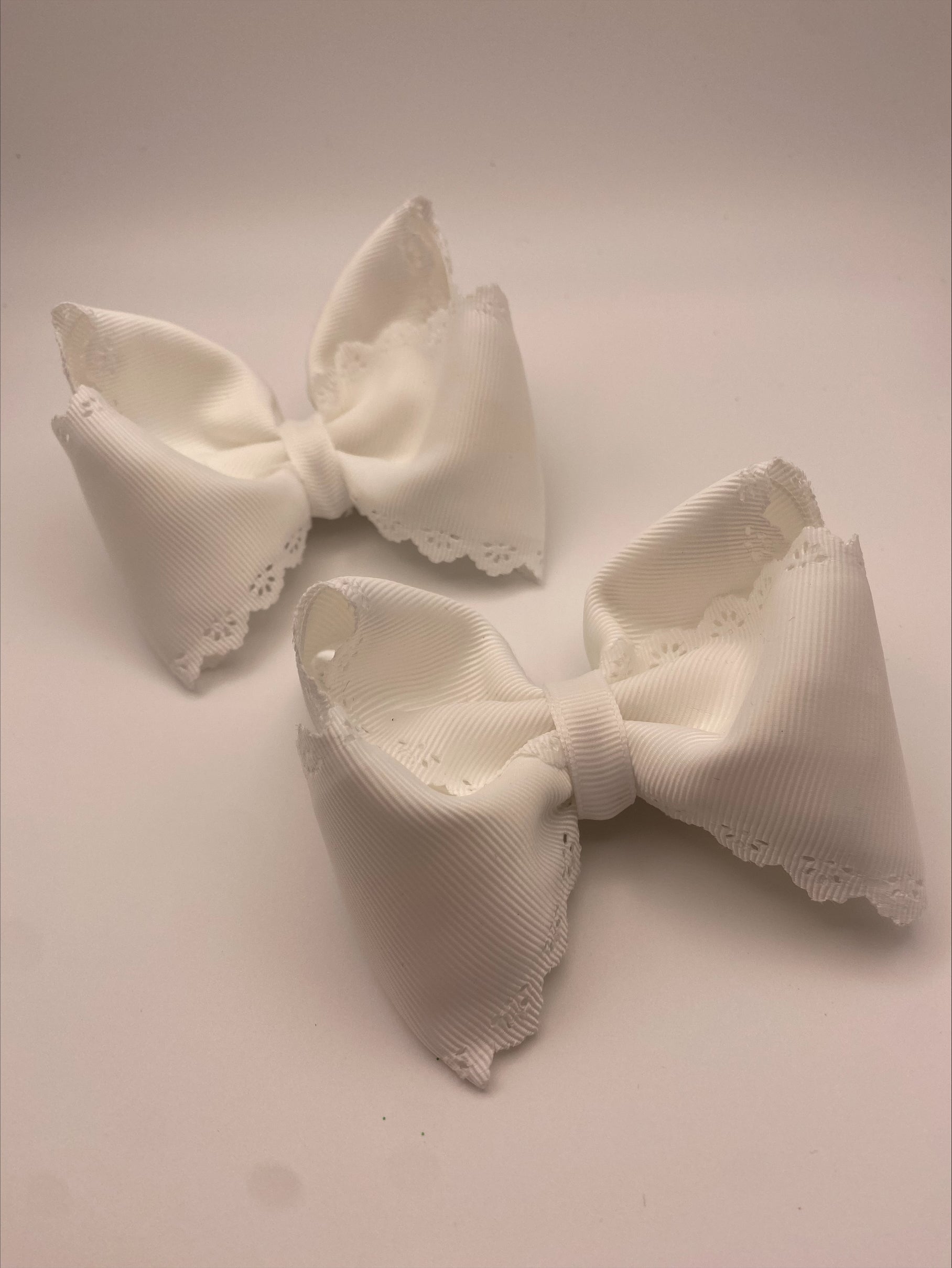 Pictured are our 3" piggies in a crisp white scalloped grosgrain ribbon on a alligator clip with teeth.